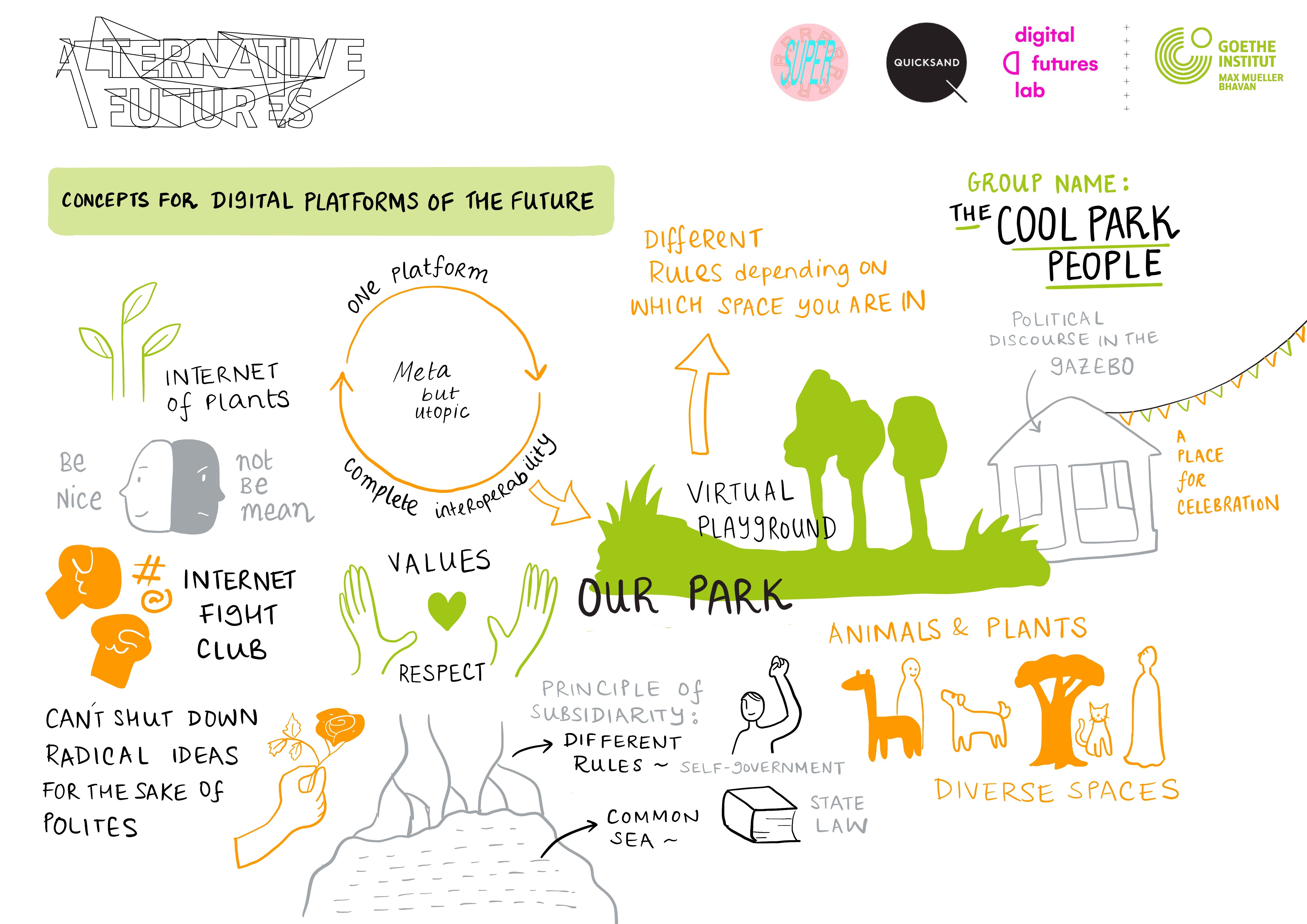 As part of the Alternative Futures workshops held in New Delhi and Kolkata, digital experts, activists, and researchers came together to reimagine the role of digital platforms in shaping civic life. At both events, our sketchnotes helped bring many complex concepts to life.