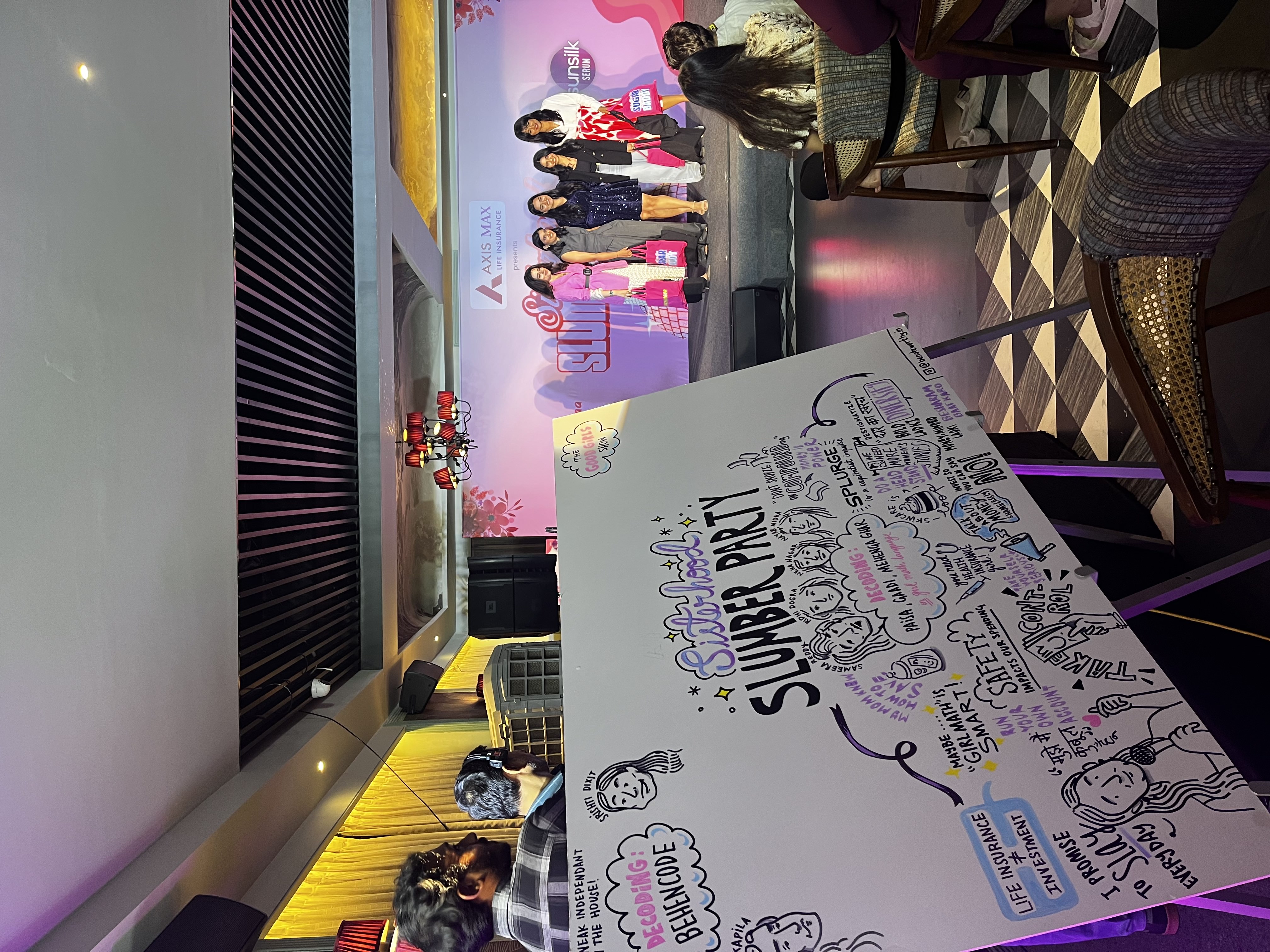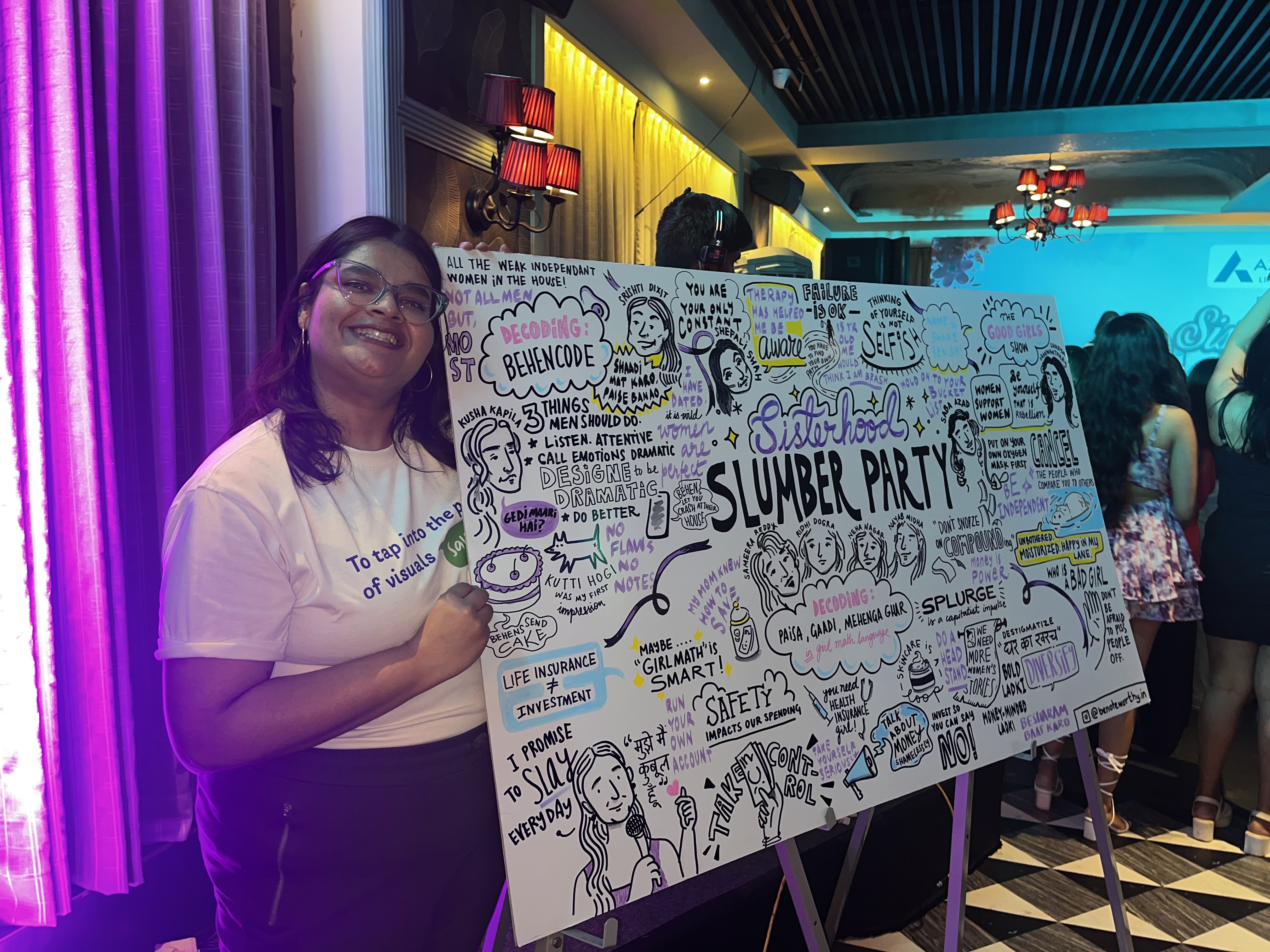 To celebrate Women’s day, 2025, Yuvaa organized the Sisterhood Slumber Party 2.0. It was an energetic event filled with fun, conversations and insights. Speakers included finance influencers, bollywood celebrities as well as musicians. We celebrated all aspects of sisterhood - from difficult conversations about the importance of savings to the fun of letting your hair down and dancing. A different event from what we’re generally used to, but Noteworthy’s sketchnotes brought focus to the invaluable life insights shared by the likes of Shefali Shah, Saba Azaad, Sameera Reddy and Neha Nagar.